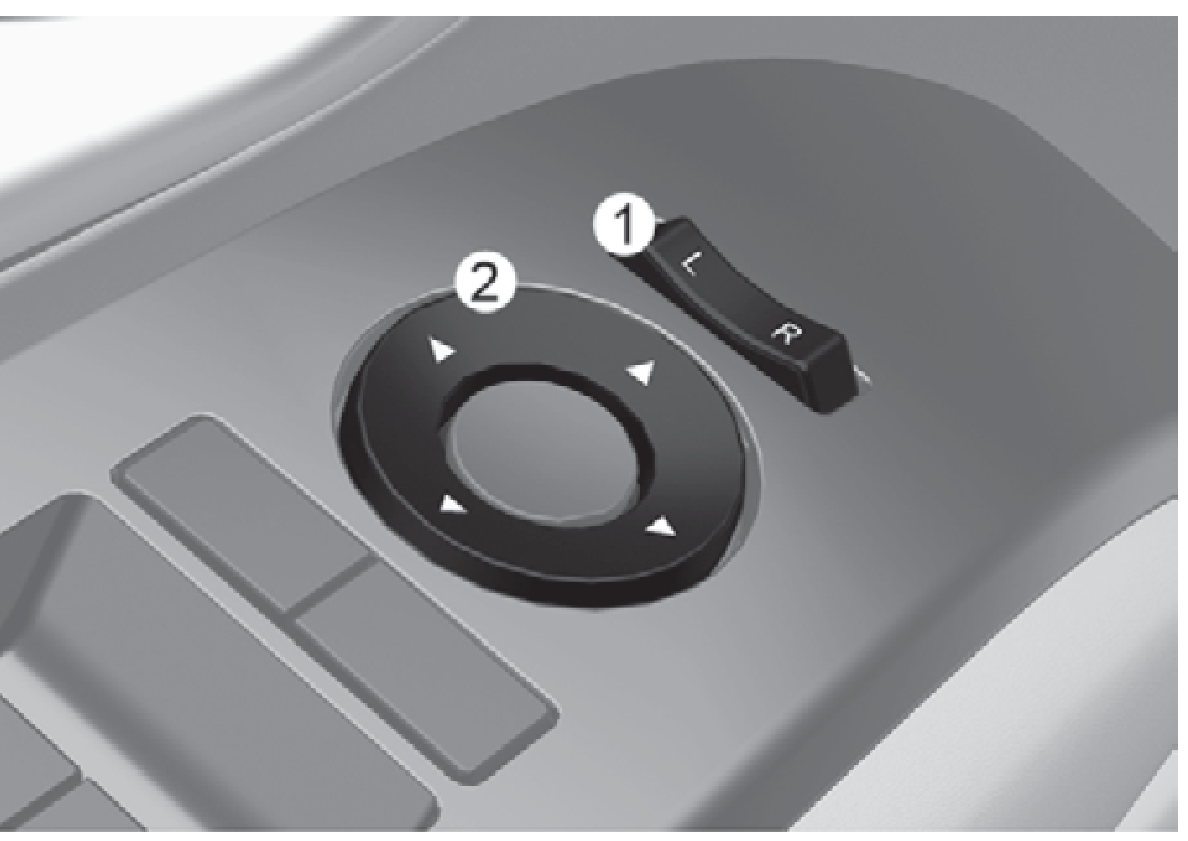 - 將控制桿(1)移動到L(左側)或R(右側),選擇您想要調整的後視鏡。