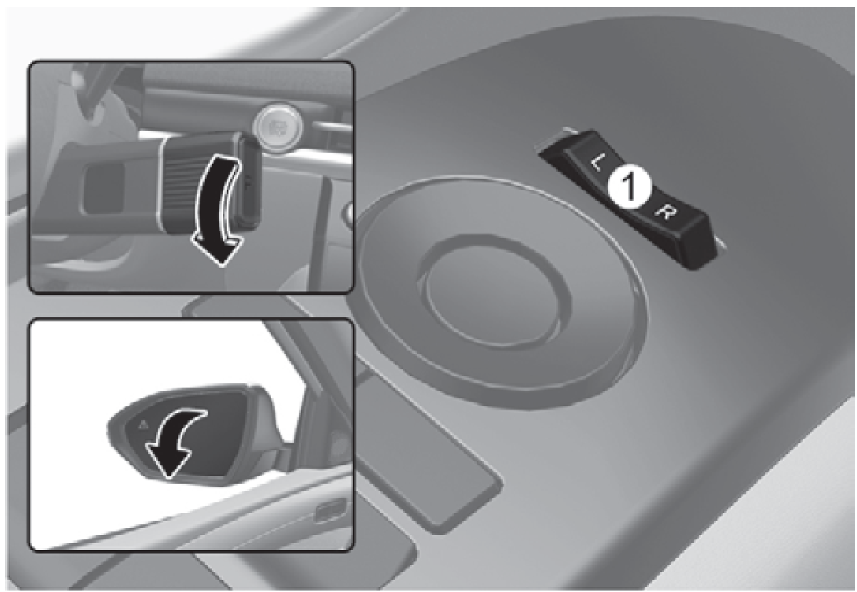 - 踩下煞車踏板,並將檔位換到R(倒檔)。按下L(左)或R(右)開關時,二個車外後視鏡角度均會向下移動到基本設定位置。