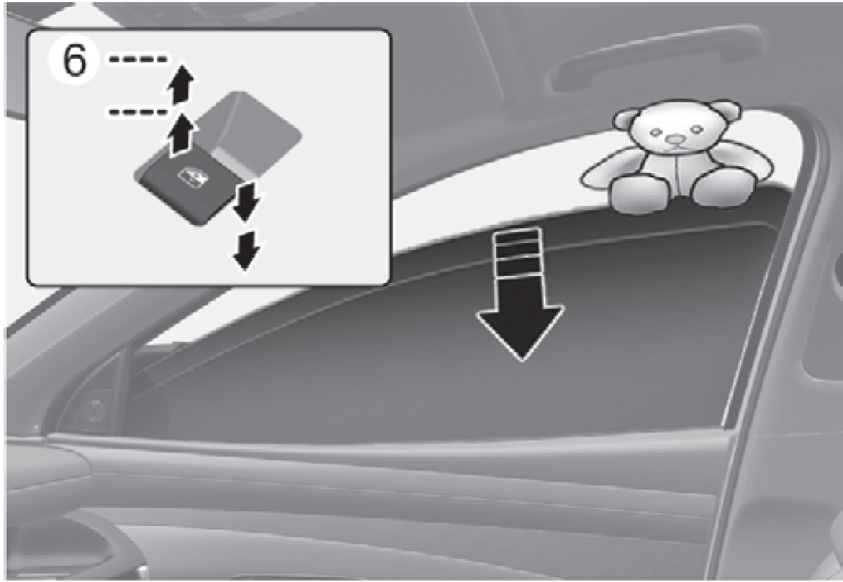 短暫將電動窗開關按下或拉起到第二段位置(6)可完全降下或升高電動窗,即使電動窗開關已經釋放。車窗操作中想要停在需要的位置時,可按下或拉起開關,然後釋放。