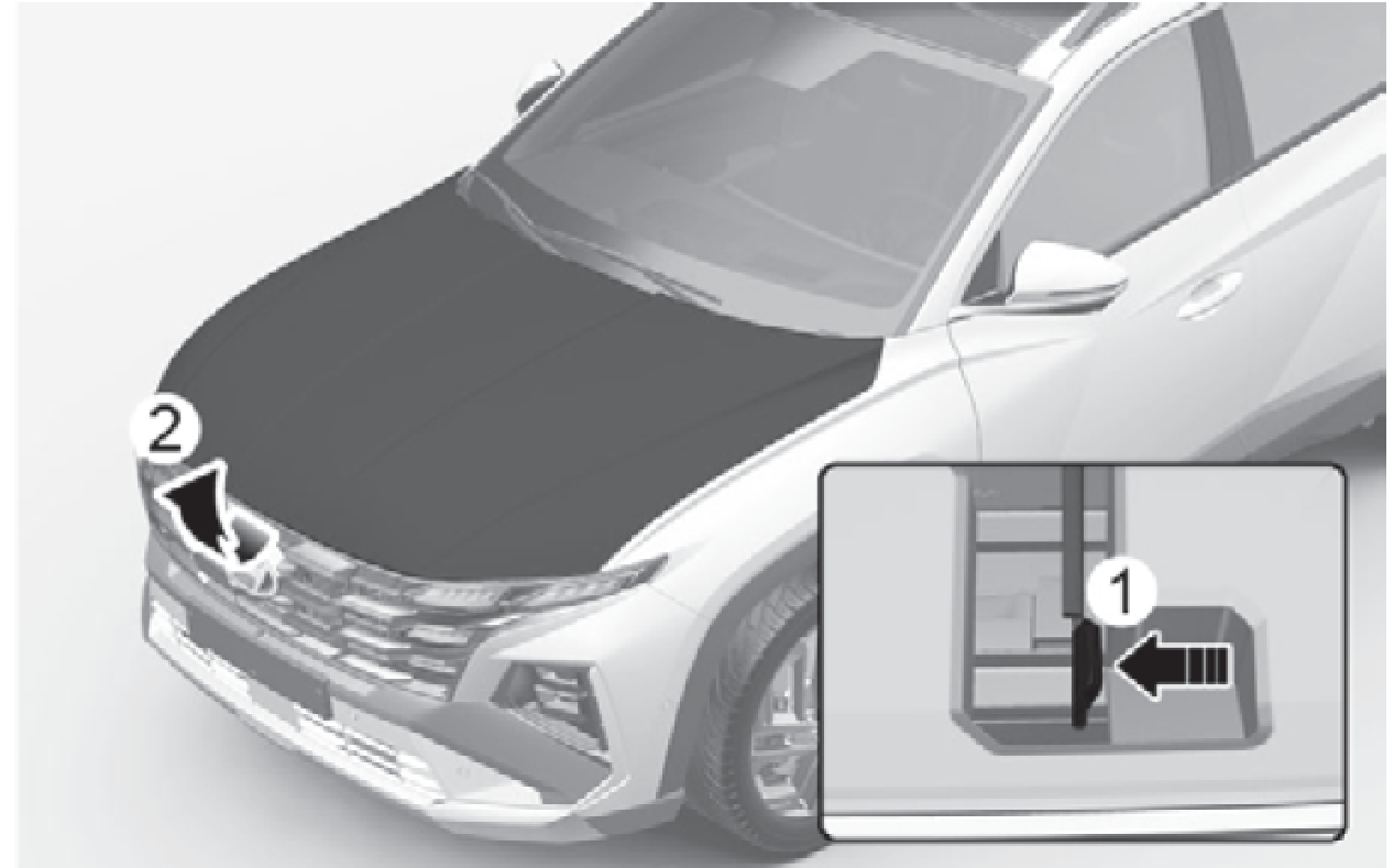 到車輛前方,稍微提高引擎蓋,將引擎蓋中央內側第二道鎖扣(1)向上推,並掀起引擎蓋(2)。