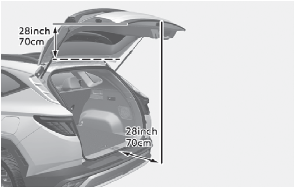 - 如果您將智慧型鑰匙留在尾門內並關閉尾門,警告聲將會響起幾秒鐘。如果發生此狀況,可按下尾門外側的電動尾門開啟按鈕打開尾門。