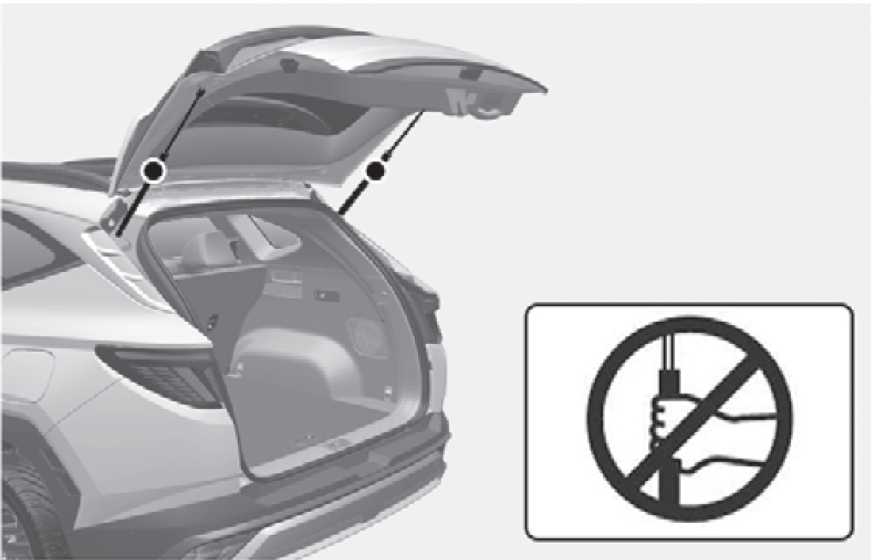 駕駛之前,必須關閉尾門。不可握住尾門支撐桿,否則尾門支撐桿可能會損壞。尾門支撐桿變形可能會導致車輛損壞和人員受傷。