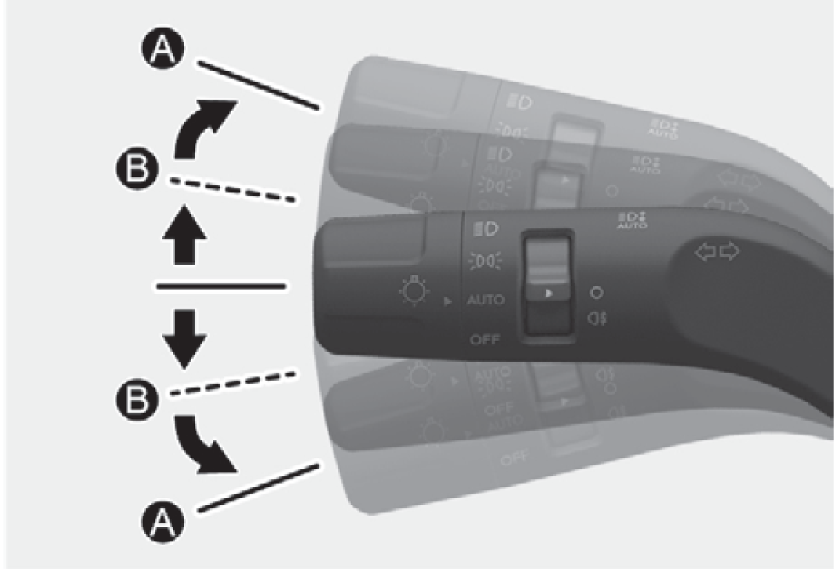 欲啟用單觸方向燈時,將方向燈控制桿向上或向下移動到位置(B),然後釋放。