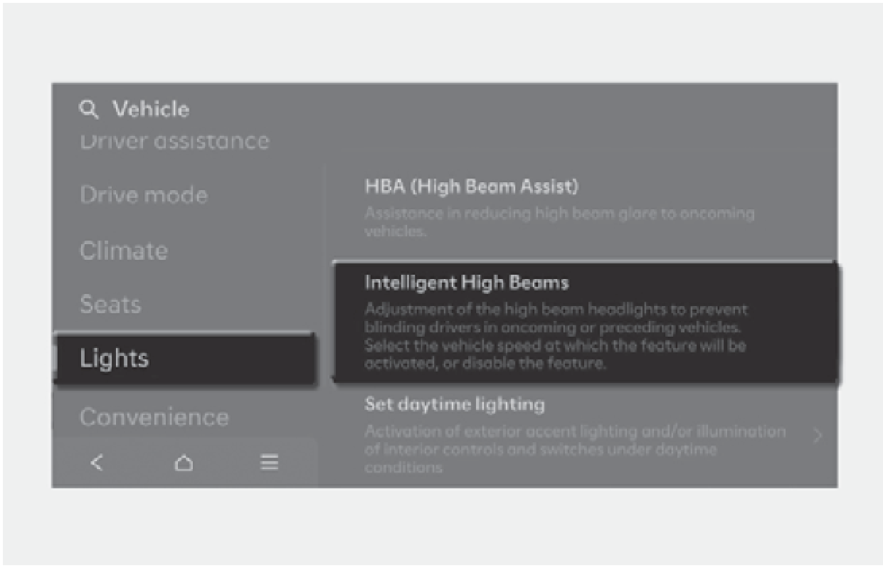 引擎啟動/熄火按鈕在ON位置時,從設定選單選擇Setup (設定) > Vehicle (車輛) > Lights (燈光) > Intelligent High Beams (或Smart High Beam) (智慧遠光燈)可啟用或停用智慧前照明系統。